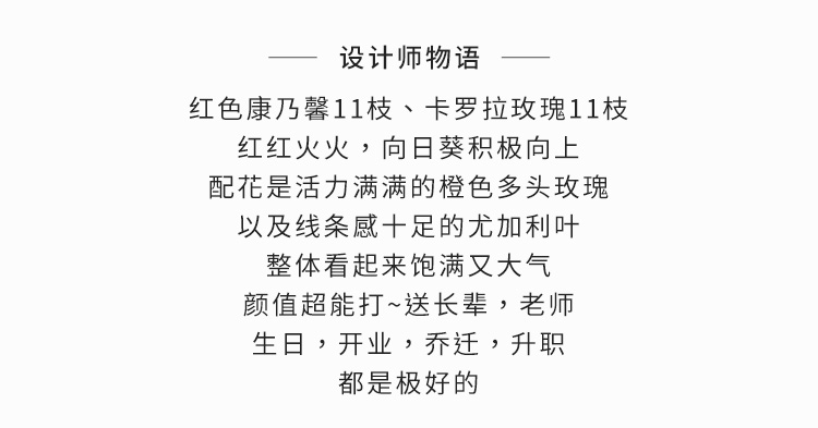 我们一直致力于持续提升服务水平,追求零客诉,我们为客户提供完善的售后服务。如果出现误单、花材不符、贺卡有误或者其他任何您不满意的情况,欢迎您第一时间与我们联系,我们将尽快为您做出回复和处理。200%退赔承诺,即如果漏单未送,订单款项全额退还给您,原订单商品同时再免费配送一次, 详见售后服务条款>>